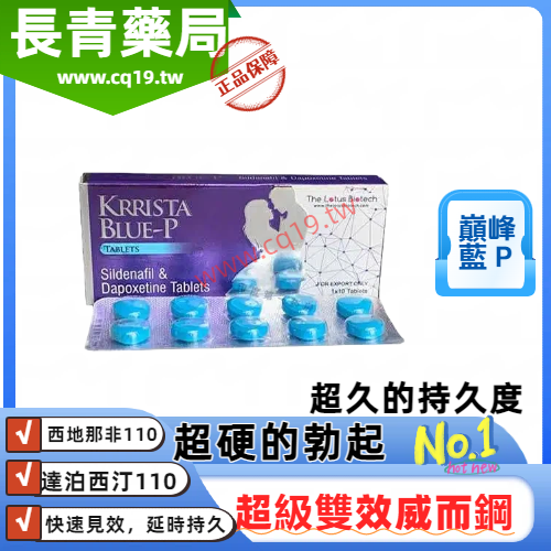 超級雙效威而鋼巔峰藍P 220mg(10顆),又名 KRRISTA BLUE-P,是OK藥局銷售的劑量最高的一款藥物。每顆藥片含有 110mg 西地那非和 110mg 達泊西汀,兩者的超強搭配讓它在市場上獨樹一幟,專為需要強效勃起支持與延長射精的男性設計。如果低劑量藥物無效,巔峰藍P是理想的選擇,提供長達6-10小時的穩定效力,讓你在親密時刻完全無後顧之憂。